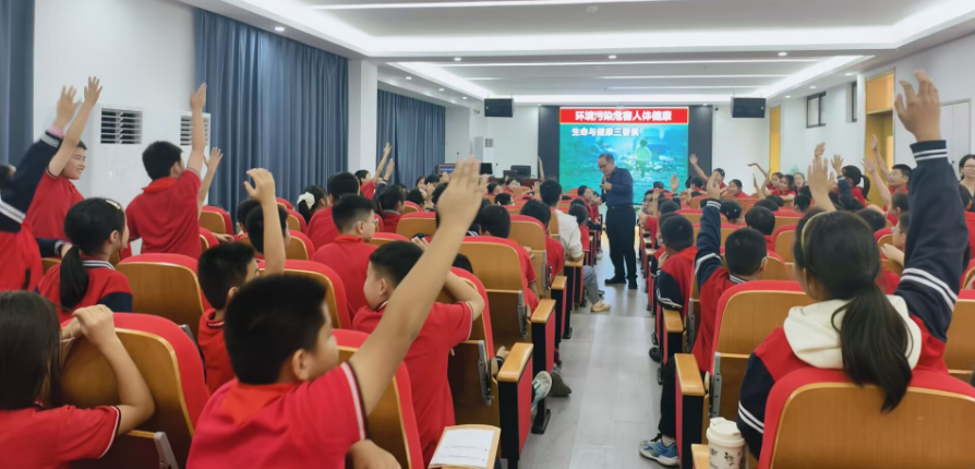 活動中,徐世球教授以生動鮮活的語言、形象貼切的比喻,將復雜的科學知識轉化為學生易于理解的內容,深入淺出地講解了環(huán)境污染的類型、危害及防護要點。從“呼吸系統如何過濾有害物質”到“人體巨噬細胞的防御機制”,他用生活化的科學解讀,讓同學們清晰認識到環(huán)境保護與自身健康的緊密關聯,F場互動環(huán)節(jié)氛圍熱烈,同學們積極舉手提問、踴躍參與趣味游戲,在輕松愉快的氛圍中將“保護環(huán)境就是保護自己”的理念深深扎根心中。