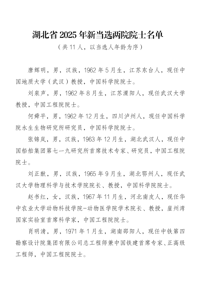 2025年金秋時節(jié),湖北又一次迎來科技豐收季。在全國新產(chǎn)生的兩院院士中,唐輝明、劉泉聲、何舜平、張錦嵐、劉正猷、趙書紅、肖明清、姜衛(wèi)平、尹周平、魯軍勇等湖北11位科學(xué)家成功當(dāng)選為中國科學(xué)院院士和中國工程院院士,其中武漢大學(xué)、華中科技大學(xué)、中國地質(zhì)大學(xué)(武漢)、華中農(nóng)業(yè)大學(xué)的7人榜上有名,一名外籍院士誕生于華中科技大學(xué)。