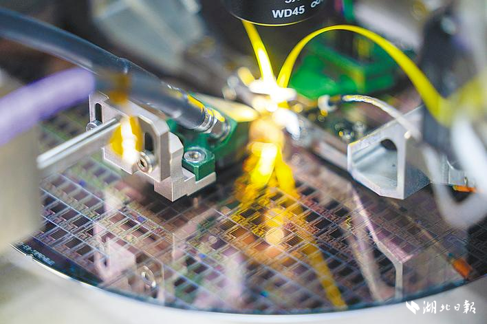 國家信息光電子創(chuàng)新中心無塵實驗室內(nèi),一片晶圓正被切割成一顆顆芯片。(湖北日報全媒記者 魏錸 攝)