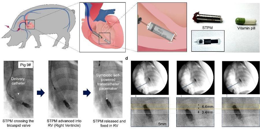 歷經(jīng)近七年聯(lián)合攻關(guān),中國科學(xué)院大學(xué)(簡稱“國科大”)、清華大學(xué)、清華大學(xué)北京清華長庚醫(yī)院、北京大學(xué)、北京大學(xué)第三醫(yī)院、中國醫(yī)學(xué)科學(xué)院阜外醫(yī)院等多家單位組成的研究團(tuán)隊(duì),在該領(lǐng)域取得重要進(jìn)展——成功研發(fā)出膠囊尺寸的微型共生型自供電無導(dǎo)線心臟起搏器。近日,相關(guān)研究成果刊載于權(quán)威期刊《自然-生物醫(yī)學(xué)工程》上。