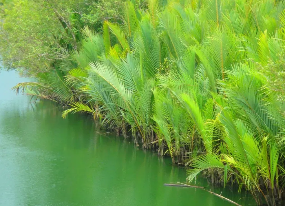 東南亞紅樹林中的水椰(Nypafruticans)群落(注意它的學(xué)名,我們后面還會提到)。水椰有重要的生態(tài)價值,果實可食(亞答子),花序汁液可制糖釀酒,葉子可建房屋。它是我國的國家二級重點保護(hù)植物丨wiki>