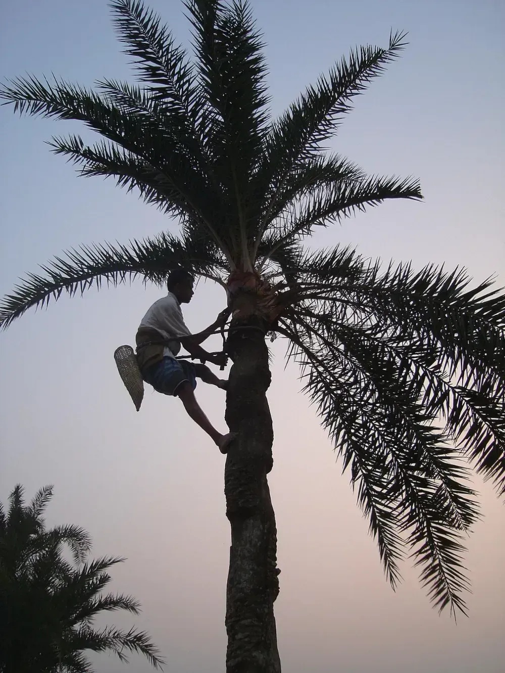 在糖棕(Borassusflabellifer)的花序上收集糖汁。左邊樹上黑色的是裝樹汁的陶罐,右邊樹上偏紅色的是糖棕的果實,其未成熟的胚乳也可以吃,在南亞和東南亞很多地方都能吃到丨wiki。