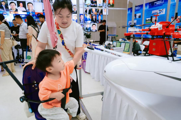 在湖北時(shí)代星光科技有限公司(以下簡(jiǎn)稱“時(shí)代星光”)的展臺(tái)前,一位小朋友好奇地指著展臺(tái)上的無人機(jī)。